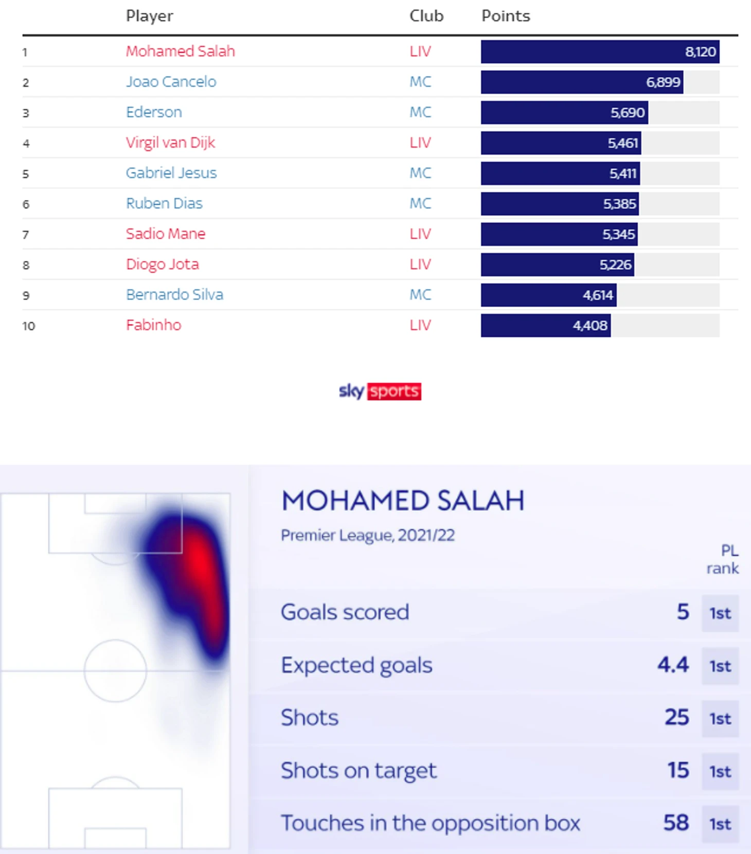 Салах возглавил таблицу результативности с пятью голами, наравне с Майклом Антонио и Джейми Варди, но защитник Сити Канселу в топе наступает ему на пятки, а Эдерсон занял третье место из-за 5 сухих матчей в 6 турах этого сезона.