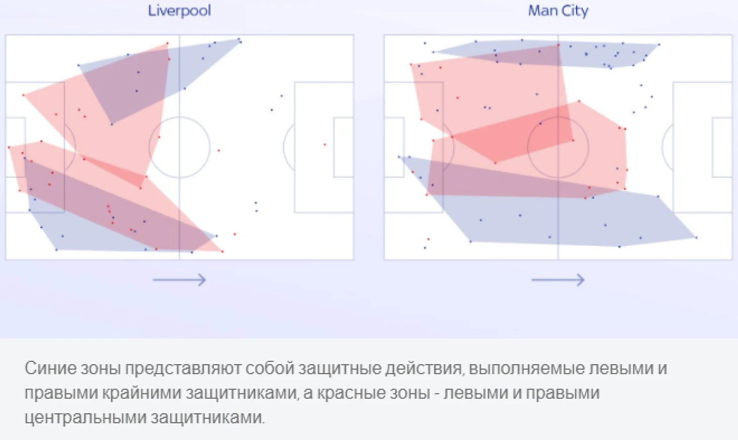 На приведенном ниже графике показаны все оборонительные действия, выполненные четверкой защитников каждой команды в этом сезоне, и показано, что два центрбэка Сити часто выдергиваются выше, чем линия защиты Ливерпуля, чтобы предотвратить контратаки и поддержать опорного полузащитника.