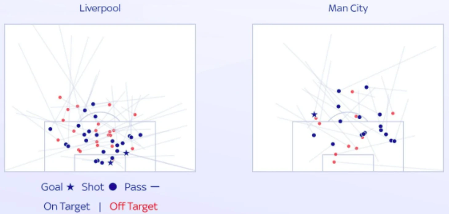 Ливерпуль, как правило, допускает кроссы по своему правому флангу и из глубины своей левоцентровой зоны полузащиты: все пропущенные голы исходят от прострелов и навесов, сделанных близ шестиметровой площадки. Между тем, "Сити" допустил 36 кроссов — это почти вдвое меньше, чем "красные", но они выглядят более удачливыми именно после передач из центра, которые уже потом достигают штрафной.