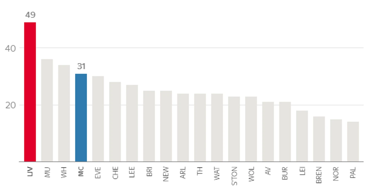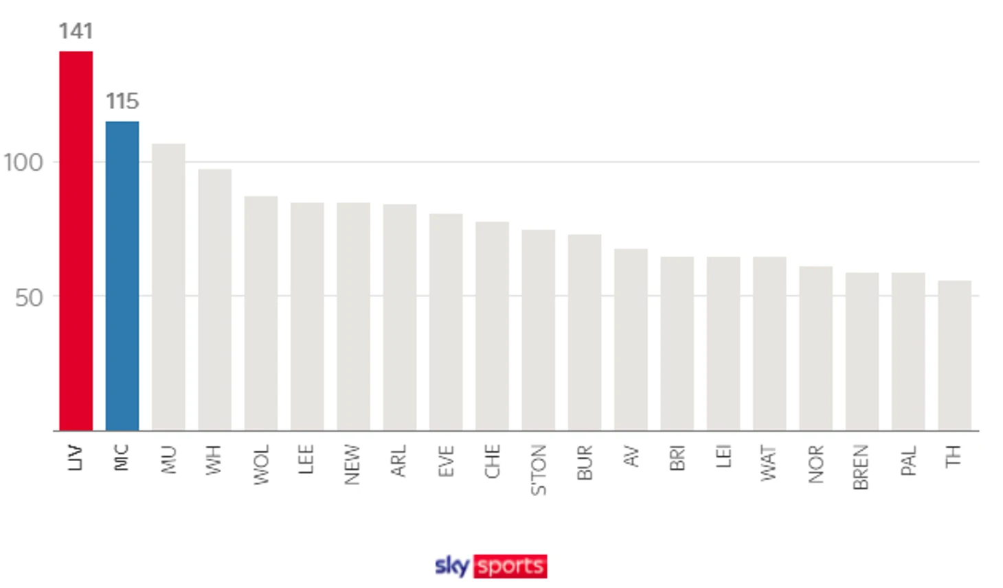 "Мерсисайцды" и "горожане" не только являются лидерами турнирной таблицы к началу 7-го тура, но и возглавляют позиции по многим другим факторам. Удивительно, но главная проблема Сити в этом сезоне — реализация, что лишний раз подчеркивает необходимость обзавестись мощной "девяткой" вроде Кейна.