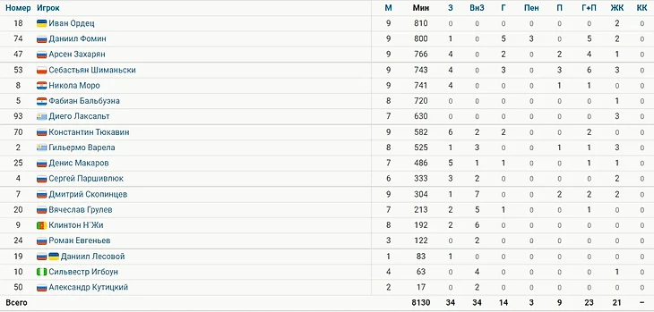 И вот в топ-3 по сыгранным минутам мы видим россиян Захаряна и Фомина. А вот сразу два легионера сидят в глубочайшем запасе: Клинтон Н'Жи, которого покупали за 8 млн провел за 9 туров на поле всего 192 минуты, а Сильвестр Игбун - чуть больше часа.