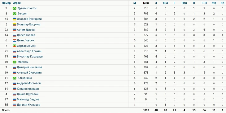 Как видно, в топ-11 по сыгранным минутам не попадает только Клаудиньо, да и то потому, что пришел по ходу сезона. Легионеры "делают игру" в "Зените", а россияне хорошо закрывают оставшиеся "дыры" в составе.
