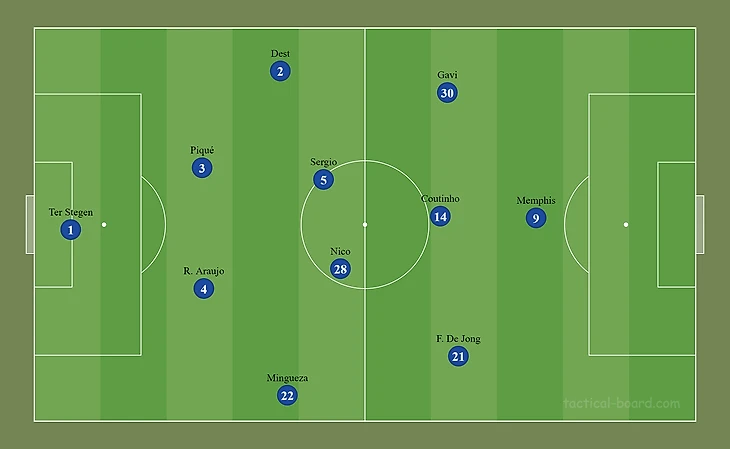 После перерыва на поле появился Роберто (сменил Нико): Серджи занял позицию, на которой действовал Коутиньо в первой половине встречи, бразилец сместился на фланг, Френки составил пару Бускетсу в опорной зоне, а Гави ушёл направо.