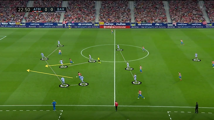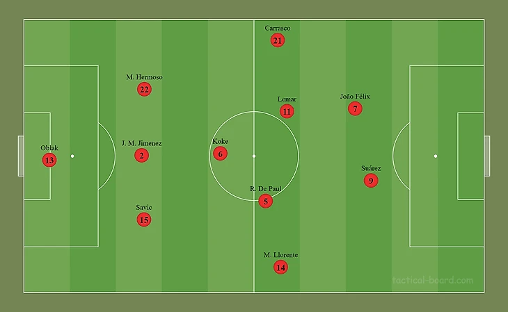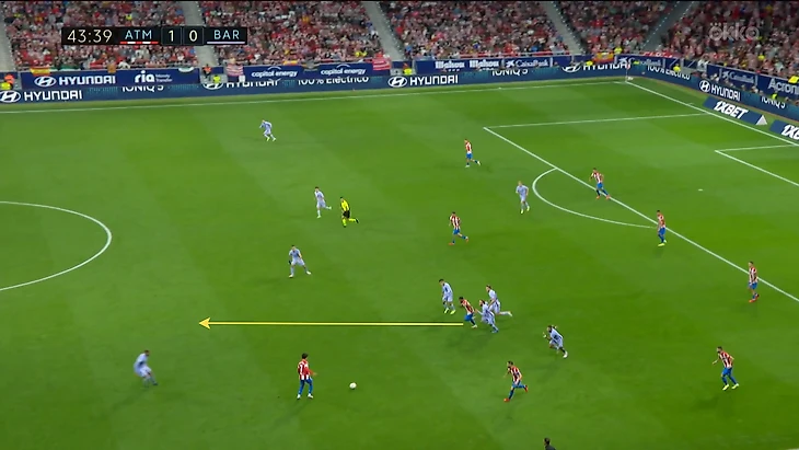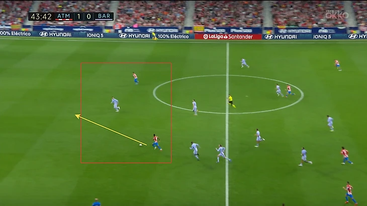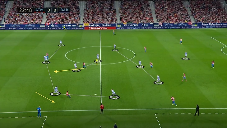 «Матрасники» вышли по привычной расстановке 3-1-4-2. Ожидаемо команда Симеоне преимущественно давила флангами (левый - 35 %, правый - 46%): там команда активно шла в отбор и проводила свои атаки. Неожиданным для меня стало появление Фелиша с первых минут: ожидал увидеть более отрабатывающего в прессинге Корреа. Собственно, мадридцы практически отказались от давления (PPDA - 28.29, что чрезвычайно много для команды Диего Пабло), чем позволяли «Барселоне» спокойно начинать и пытаться строить позиционные атаки. Вероятно, аргентинский тренер специально дал сопернику такую возможность, зная о проблемах нынешней «Барсы» в данном аспекте игры.