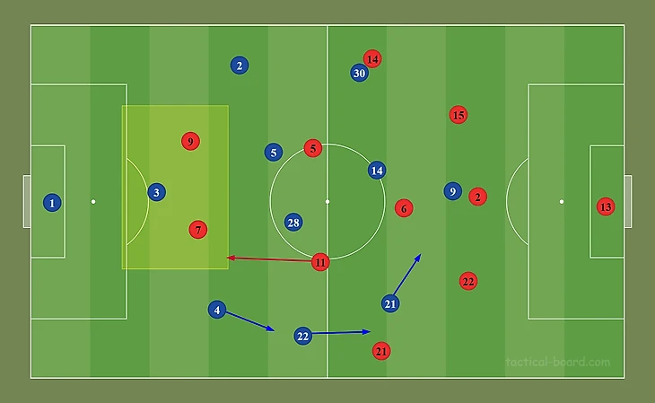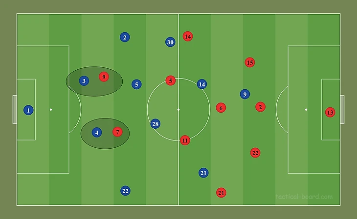 Использование Де Йонга на правом фланге - очень странный ход: данная позиция не использует лучшие качества голландца, более того, это привело к печальном исходу, так как Френки не является игроком фланга и тяготеет к центру, из-за чего Депай или Мингеса были вынуждены поддерживать ширину своими смещениями на фланг.