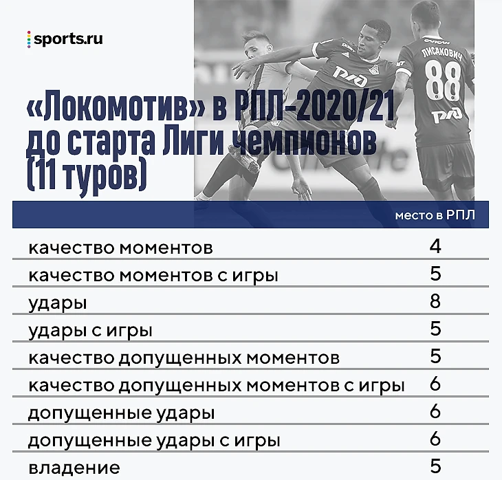 Правда, продвинутая статистика говорила, что по качеству игры «Локо» был не так хорош. Команда Николича стала лучшей по соотношению голов к ударам, второй – по реализации явных моментов и соотношению реальных очков к ожидаемым.