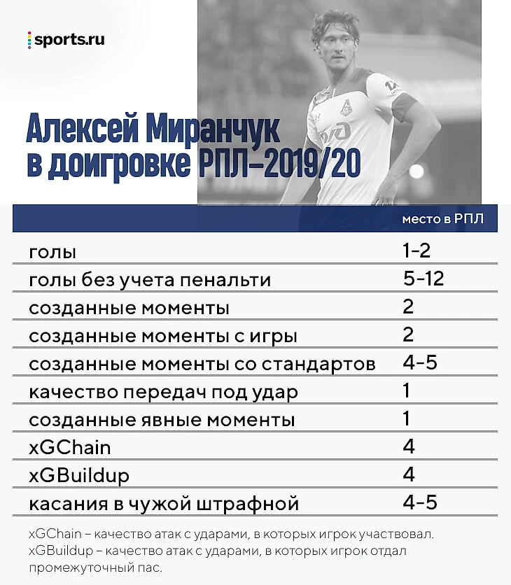 В доигровке сезона-2019/20 «Локомотив» забил всего 9 голов в восьми матчах, 7 из них – Алексей Миранчук. Конечно, нужно помнить, что 4 из них Миранчук забил с пенальти (а еще один одиннадцатиметровый не реализовал), но все равно форма Алексея и его вовлеченность в разные стадии атак «Локо» поражала.