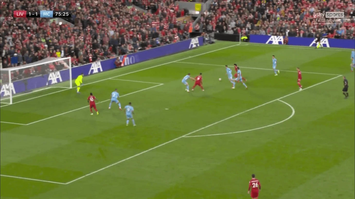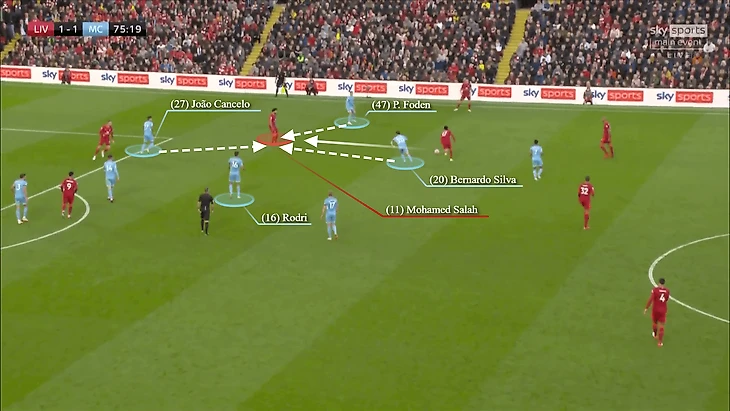 Оказавшись вне досягаемости Канселу, Бернардо и Фодена, Салах совершил два касания левой ногой, расположив себя внутри штрафной. Первое касание привело его в штрафную, а второе было использовано для ложного замаха, снова переложив мяч под левую ногу.