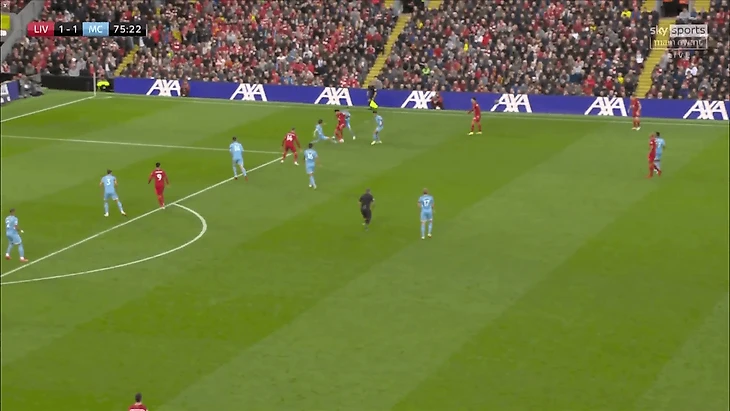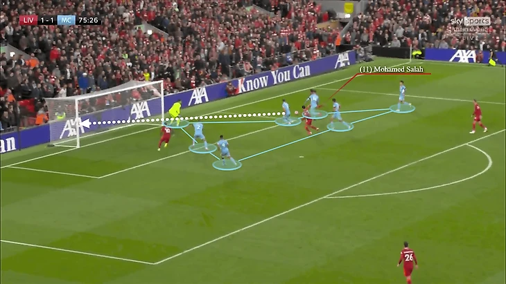 Салах перекатил мяч левой бутсой для того, чтобы избежать подката Бернардо, и еще одним быстрым касанием, на этот раз правой ногой, оставил всех трех игроков «Сити» позади себя.
