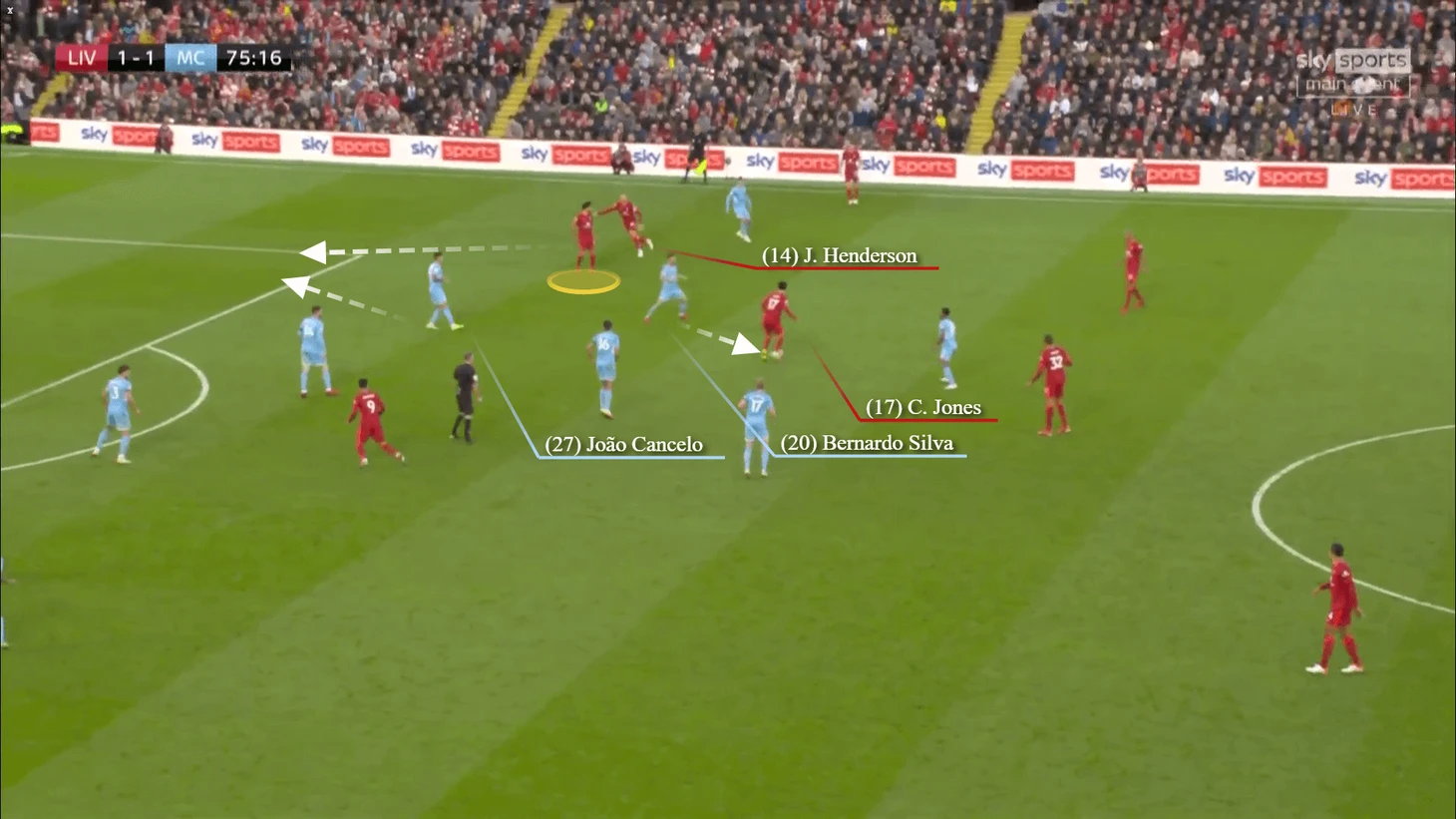 Все еще владевший мячом Джонс сумел ускользнуть от Бернардо и сделал пас на Салаха.