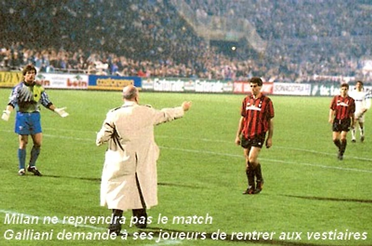 Напряжение нарастало. Итальянские лидеры в ярости просят своих игроков покинуть поле. "Конечно, это особенная игра, которую я никогда не забуду. Я никогда не встречался с командой, которая отказывалась возобновить игру. В тот вечер все были удивлены реакцией миланцев», - скажет позже L’Equipe Бо Карлссон. Все, кроме, пожалуй, Бернара Тапи, который не забыл, что в 1988 году похожая история уже выручила Милан в трудной ситуации. Тогда после ничьей 1-1 в Милане, итальянцы в Белграде в ответном матче 1/8 финала против Црвены Звезды проигрывали 0-1 и остались в численном меньшинстве после удаления Вирдиса, как вдруг на стадион опустился густой туман и игра была остановлена. Принято было решение переиграть матч на следующий день… игнорируя забитый хозяевами гол и удаление у итальянцев! И на этот раз Милан выстоял против утомленного соперника (1-1), а в серии послематчевых пенальти оказался сильнее.