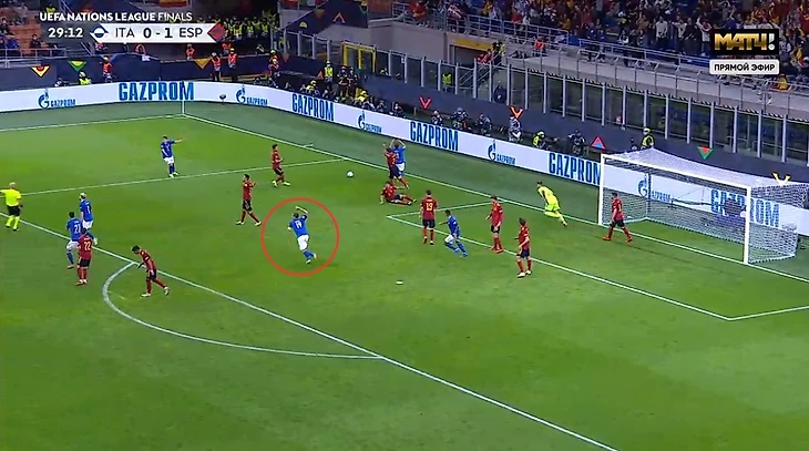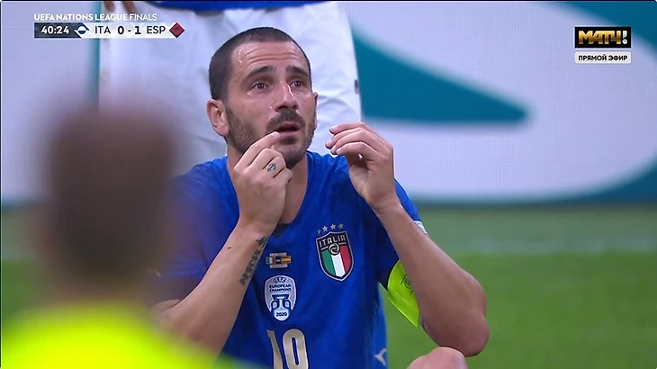 На 30-й минуте итальянцы разыграли штрафной у чужих ворот, но Николо Барелла затоптал 17-летнего дебютанта Гави. Бонуччи был крайне недоволен, что реф зафиксировал фол – и рванул к нему с претензиями.