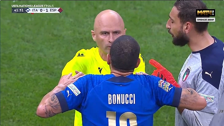 Сергей Карасев получил назначение на один из главных матчей перерыва на сборные – полуфинал Лиги наций между Италией и Испанией в Милане. С самого начала итальянцы оспаривали почти каждый свисток российского судьи – но два самых ярких момента произошли с участием капитана Леонардо Бонуччи.