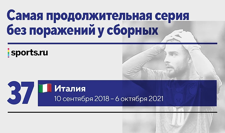 В сентябре команда Манчини сыграла со Швейцарией 0:0 и разгромила дома Литву 5:0 – для Италии это были 36-й и 37-й матч без поражений подряд. Никто на международном уровне не достигал такой отметки: Бразилия 1990-х и Испания 2000-х останавливались на 35 играх.