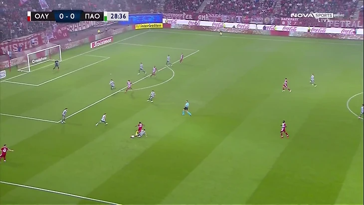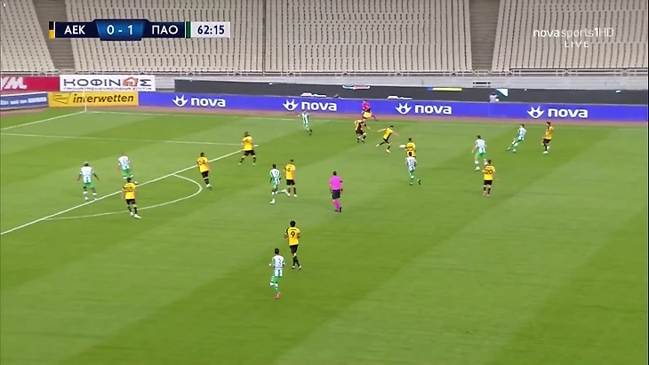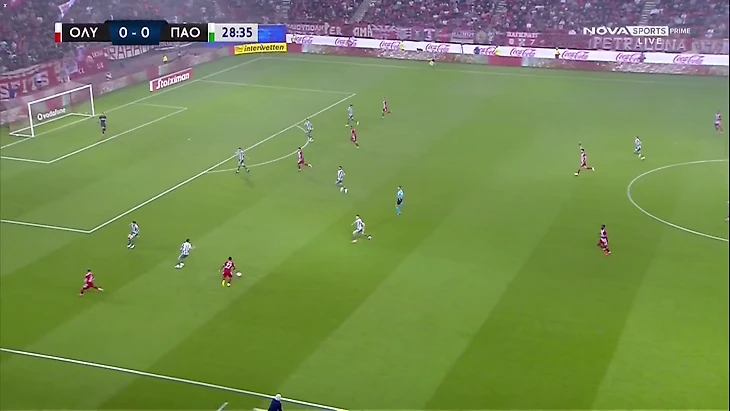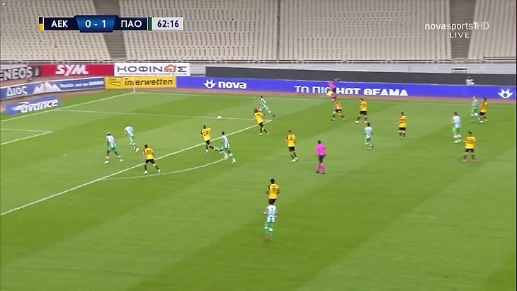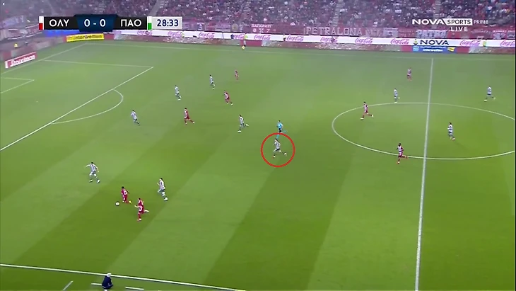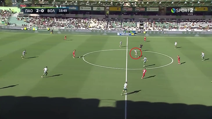 2) Основная схема Панатинаикоса 4-2-3-1, в ней Сотирис занимает позицию правого опорного полузащитника. Он не является игроком, через которого мяч доставляется в нападение, так как для этого в команде есть опытнейший Рубен Перес и хорошо нам знакомый Маурисио. Функция Александропулоса заключается в том, чтобы закрывать зоны, в которые не успевают его более возрастные партнёры, с чем он справляется на достойном уровне.