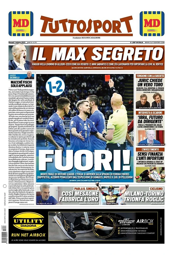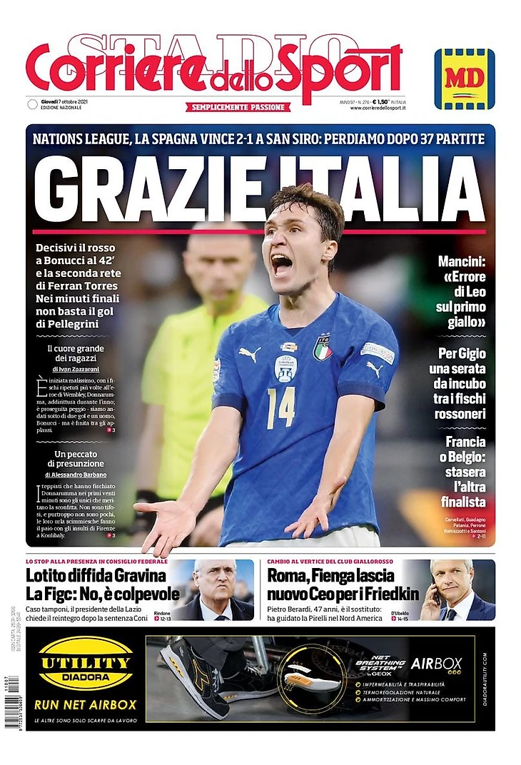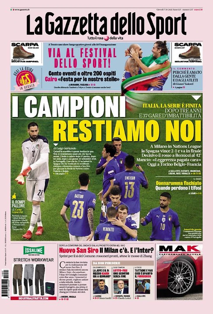 Лига Наций, Испания выиграла 2:1 на «Сан Сиро»: проиграли спустя 37 матчей. Решающими стали красная Бонуччи на 42 минуте и второй гол Феррана Торреса. В последние минуты не достаточно гола Пеллегрини.