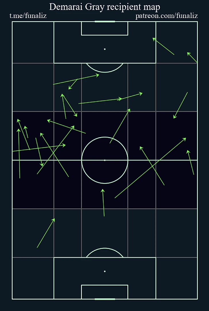 Всё же куда больше команда Бенитеса находилась в среднем / низком блоке — ещё раз о нём. Во-первых, непосредственно по нападающим: Грей и Рондон находились на небольшом отдалении от остального оборонительного блока и держались вблизи опорников "МЮ" — сложно сказать, не находясь в штабе Бенитеса, насколько осознанно эти двое уходили чуть выше, но как факт — Демарай принял всего две передачи в пределах своей половины поля (всего — 19), для контратак это важно.