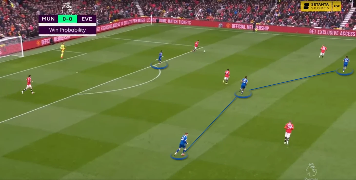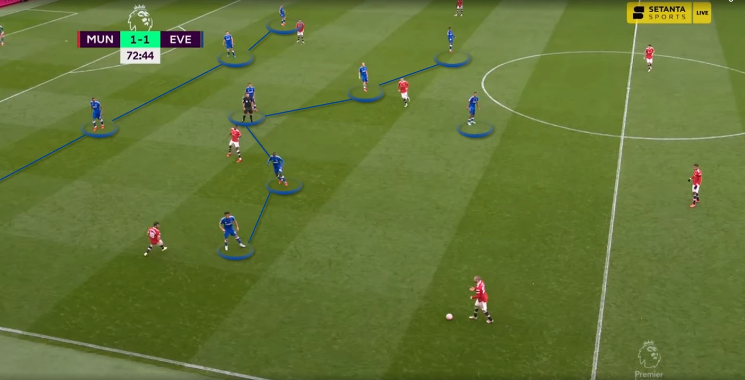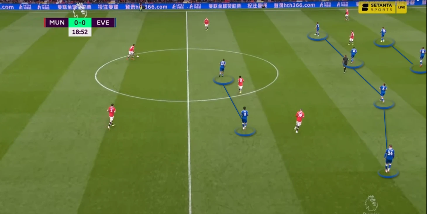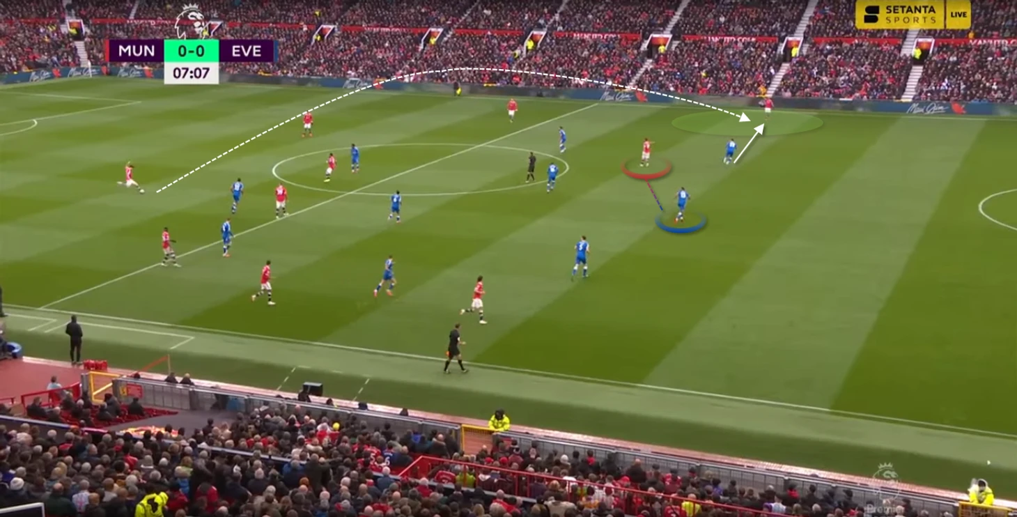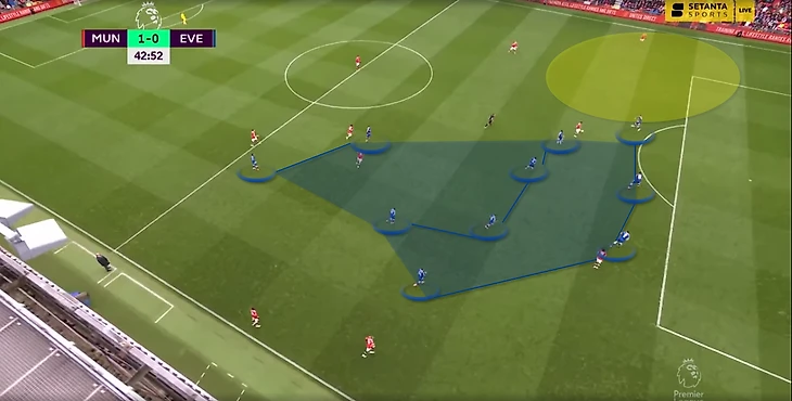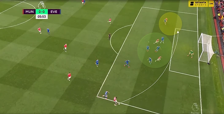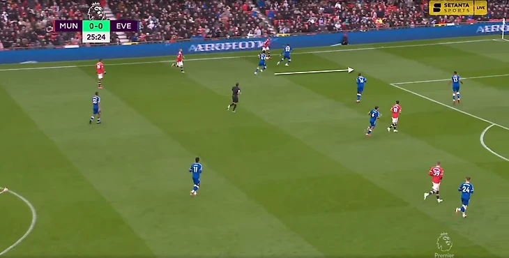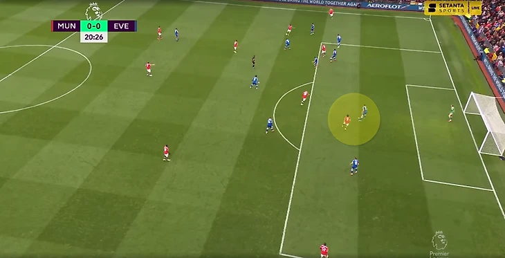 По сути отсюда "МЮ" и взял своё преимущество в нон-шот метриках — "Эвертон" не очень здорово реагировал на то, как соперник пользуется горизонтальной компактностью их блока и за счёт быстрых передач, переводя мяч на противоположный фланг, создаёт изоляции для вингеров.