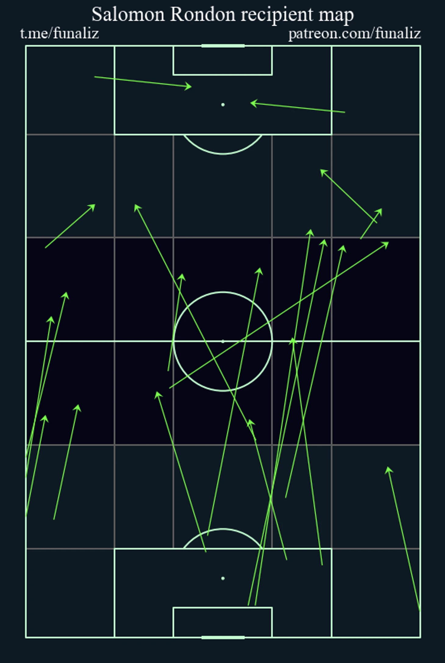 На нападающего в такой ситуации складывается не самая завидная роль — много единоборств и черновой работы при том, что нет гарантии, что всё это будет в итоге приведёт к моментам или голам конкретно у него. Рондон здорово справился со своей работой — выиграл 6 из 9 верховых дуэлей.