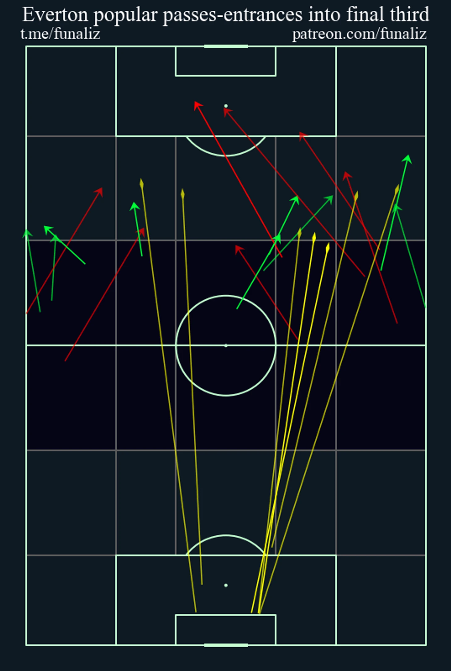 Как видно по одной из карт выше, второй по популярности кластер передач-входов "Эвертона" в финальную треть (отмечен жёлтым) начинался не из второй трети, а из первой. Да и в принципе тренд команды Бенитеса на прямолинейность очевиден — это было заметно и по directness, и по доле лонгболлов от общего количества передач (61 из 288 — больше 20%).