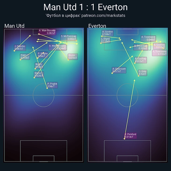 "МЮ" удалось доставить проблемы — по нон-шоту набрали 2,9, по xT — 2,12; пасовые метрики явно намекают на то, что команде Сульшера удавалось заходить в опасные зоны. В большей степени это актуально для левого фланга, где были Марсьяль, Шоу, куда заходил Фернандеш (у "Эвертона" там, напомним, Годфри и Таунсенд).
