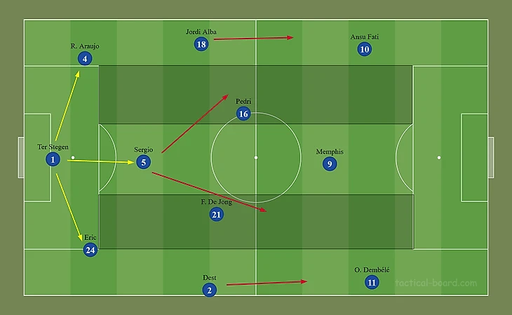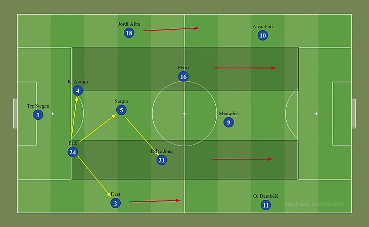 Учитывая желание видеть атакующую игру от каталонцев, необходимо иметь чёткие инструкции по действию в прессинге: Фати и Дембеле должны идти до вратаря, тем самым, не давая соперникам спокойно начинать билд-ап. Важное примечание: наиболее эффективным является диагональное движение, так как в таком случае игрок перекрывает наибольшее пространство для потенциальной передачи.