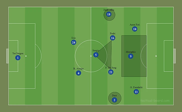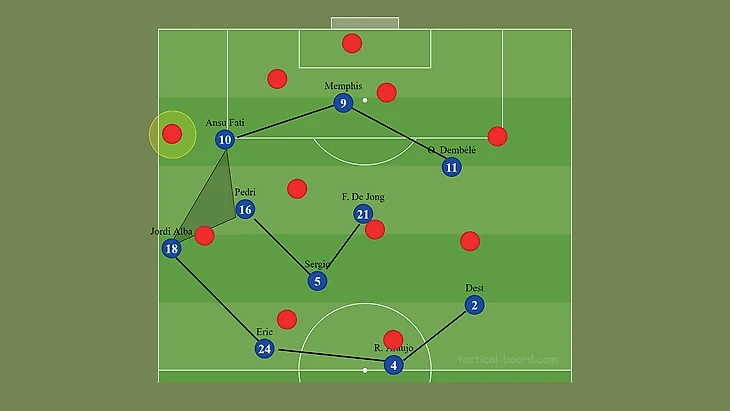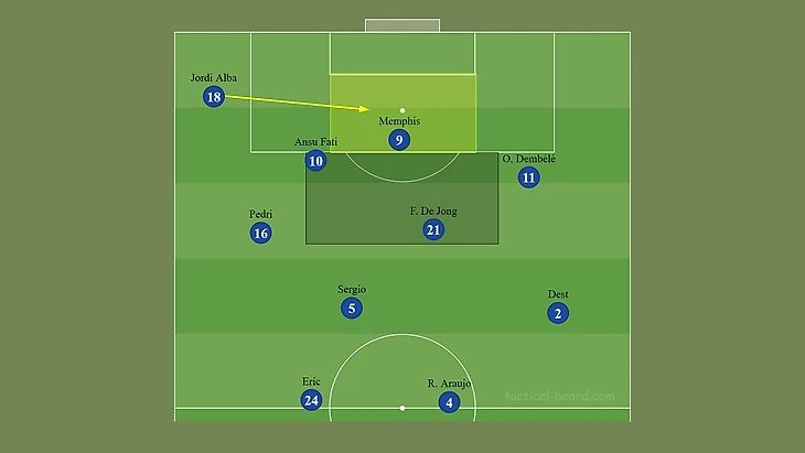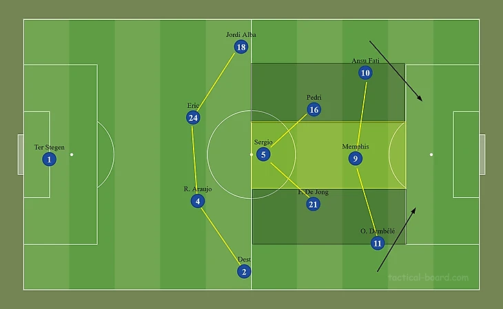 Грамотное насыщение центра поля — один из главных аспектов для организации эффективной позиционной атаки: Бускетс, Френки, Педри образуют креативный и подвижный треугольник, что позволяет быстрее продвигать мяч. Мемфис — не форвард завершения: он должен искать пространства между линиями, чтобы получить мяч в опасной зоне перед чужой штрафной.