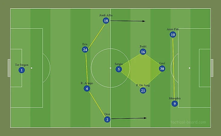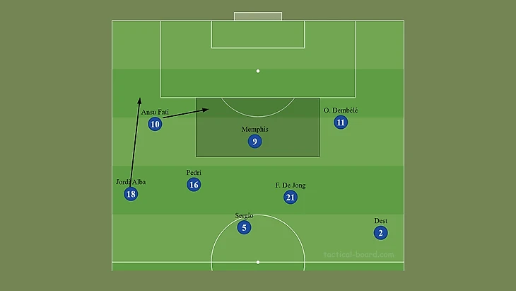 Необходимо, чтобы крайние нападающие (Фати/Дембеле) и латерали (Альба/Дест) не мешали друг другу. Не должно возникать ситуаций, когда фланговые игрока встречаются в одной зоне. Для этого требуется своевременное смещение нападающих с края в центр при подключениях крайних защитников.