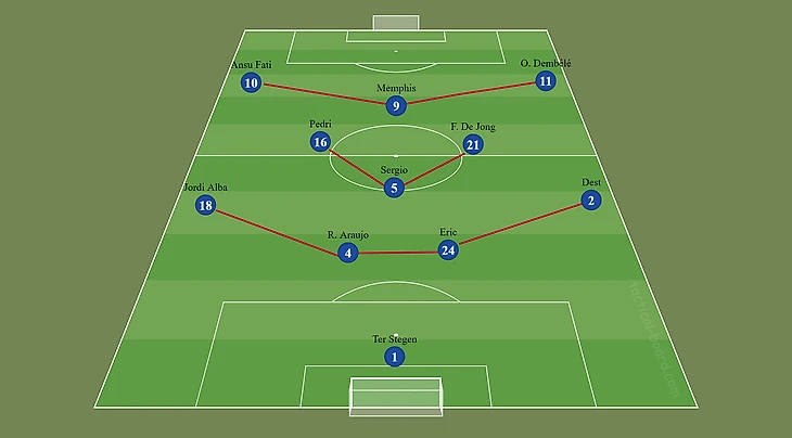 В компанию к капитану в центр поля поставим Педри и Френки. Оба игрока очень важны для продвижения мяча: они способны открываться между линиями, находить пространство, а также освобождать зоны для партнёров.