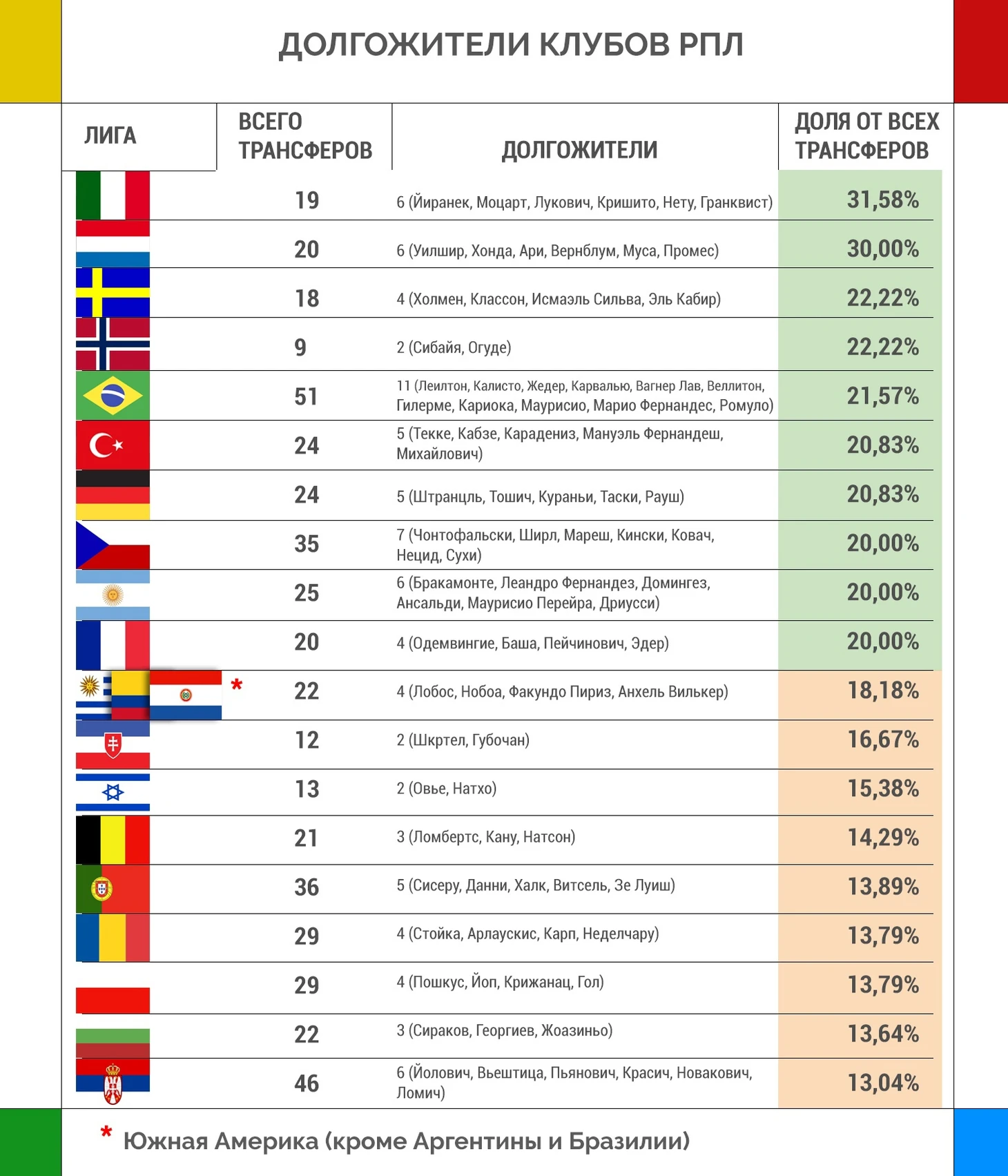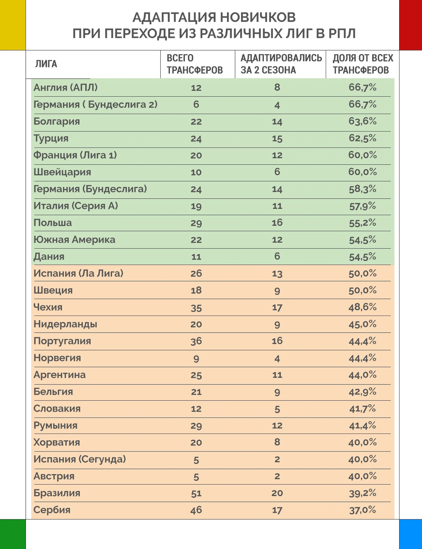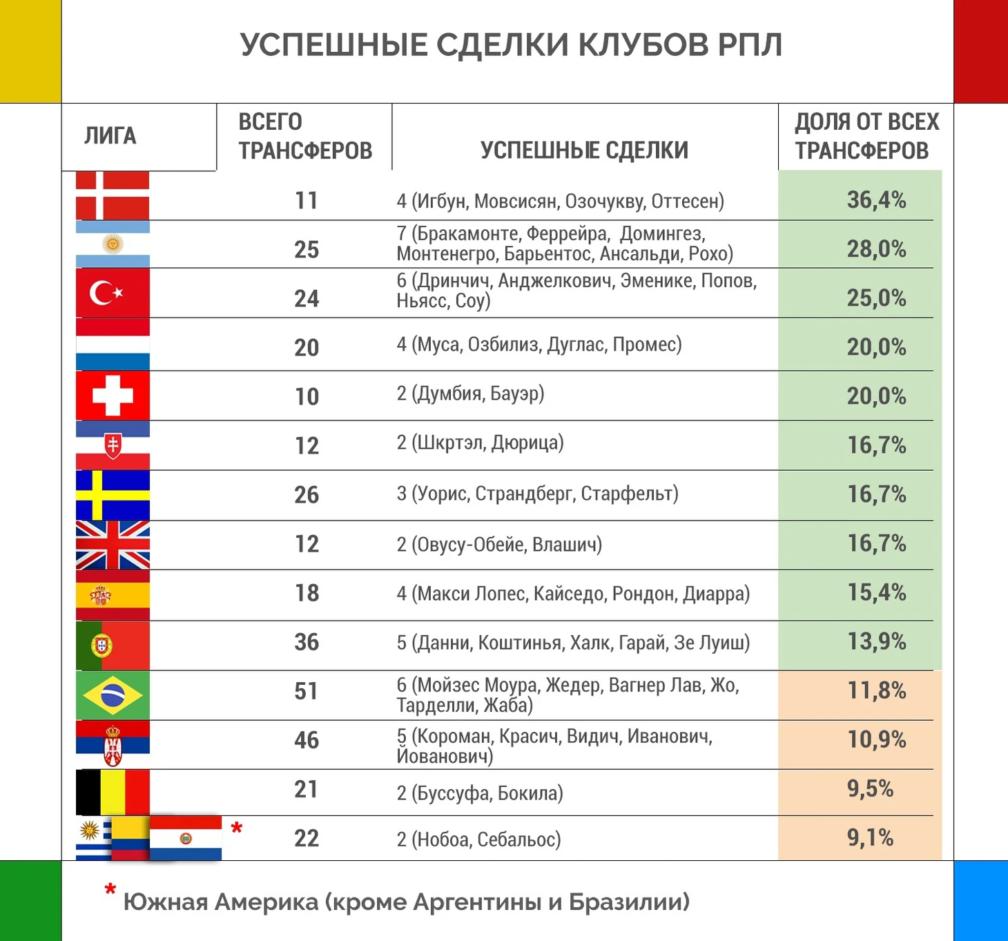 В лидерах по доле успешных сделок среди всех стран Дания (благодаря Сильвестру Игбуну и Юре Мовсисяну, а также Оттесену и Озочукву, пришедшими в “Амкар” и “Урал” свободными агентами и впоследствии проданными за деньги).
