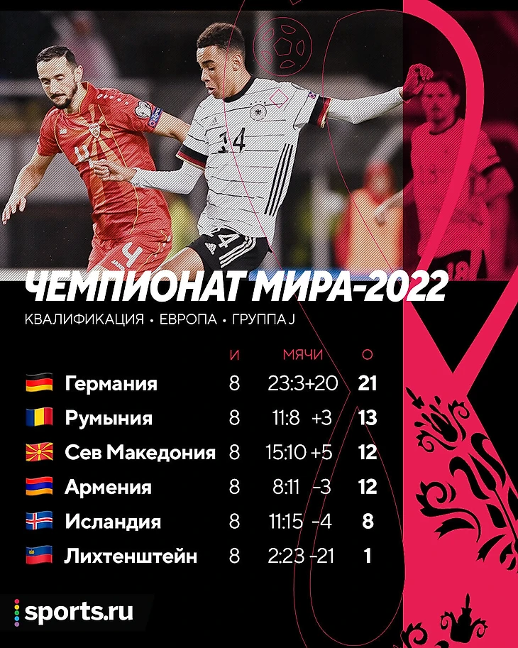 • Первым участником ЧМ-2022 от Европы стала Германия – немцы разгромили Северную Македонию (4:0) в гостях, хотя еще перед Евро проигрывали ей дома. Команда Ханси Флика гарантированно займет первое место в группе J. За второе борются Румыния (13 очков), Македония и Армения (по 12). Плюс математика оставляет шансы Исландии.