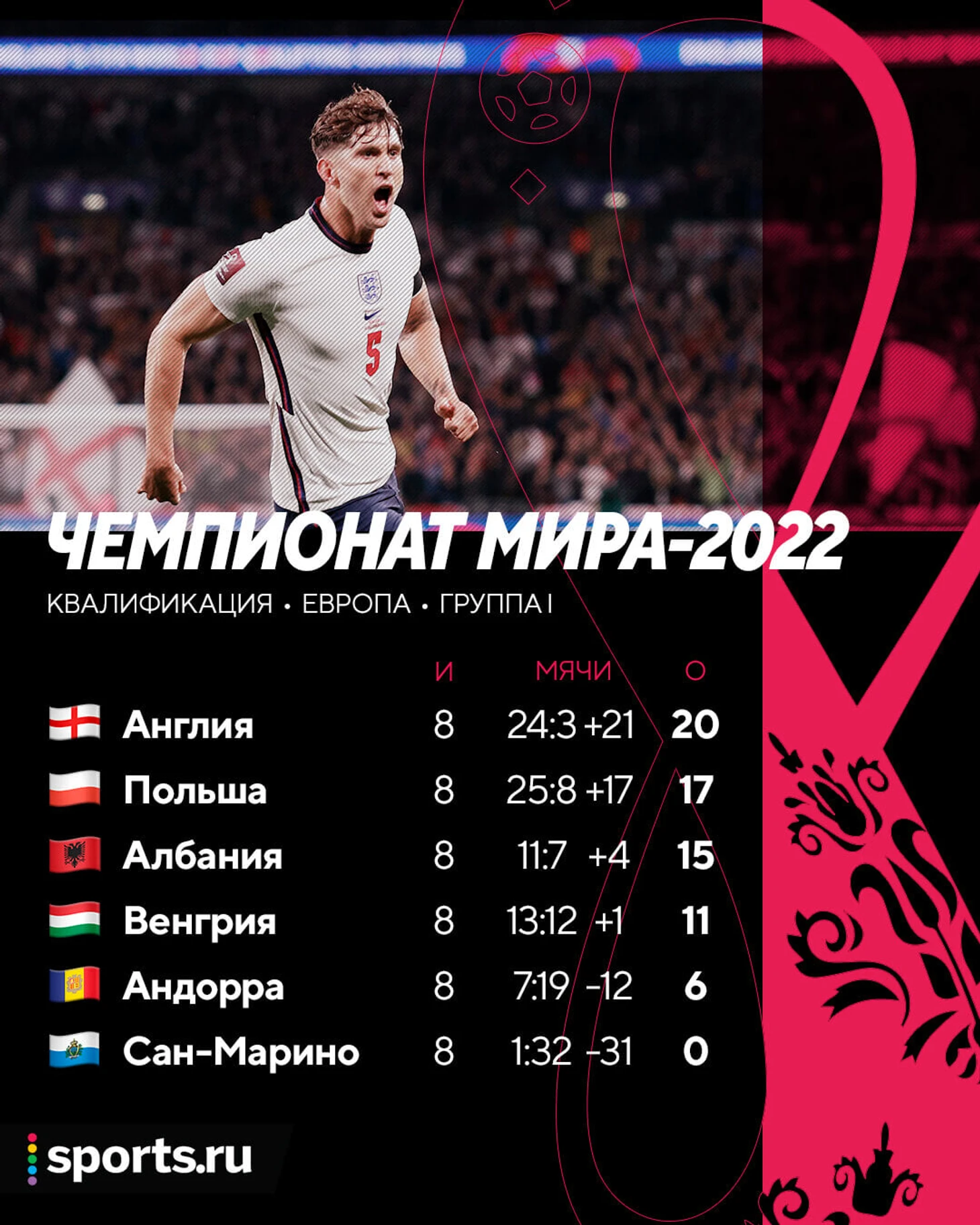 • Англия еще не решила вопрос квалификации, хотя сложно вряд ли будет: впереди Албания и Сан-Марино. Для финиша в топ-2 (хотя этого Англии, естественно, мало) надо обойтись без поражения с Албанией.