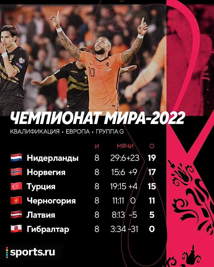 Победа над Черногорией в следующем туре гарантирует Нидерландам стыки, но для первого места нужно не проиграть Норвегии в заключительном туре. Норвежцам надо выигрывать оба матча (первый – с Латвией), тогда они точно поедут в Катар. Ну а туркам остается надеяться, что норвежцы хотя бы один матч проиграют. Иначе им не помогут и шесть очков.