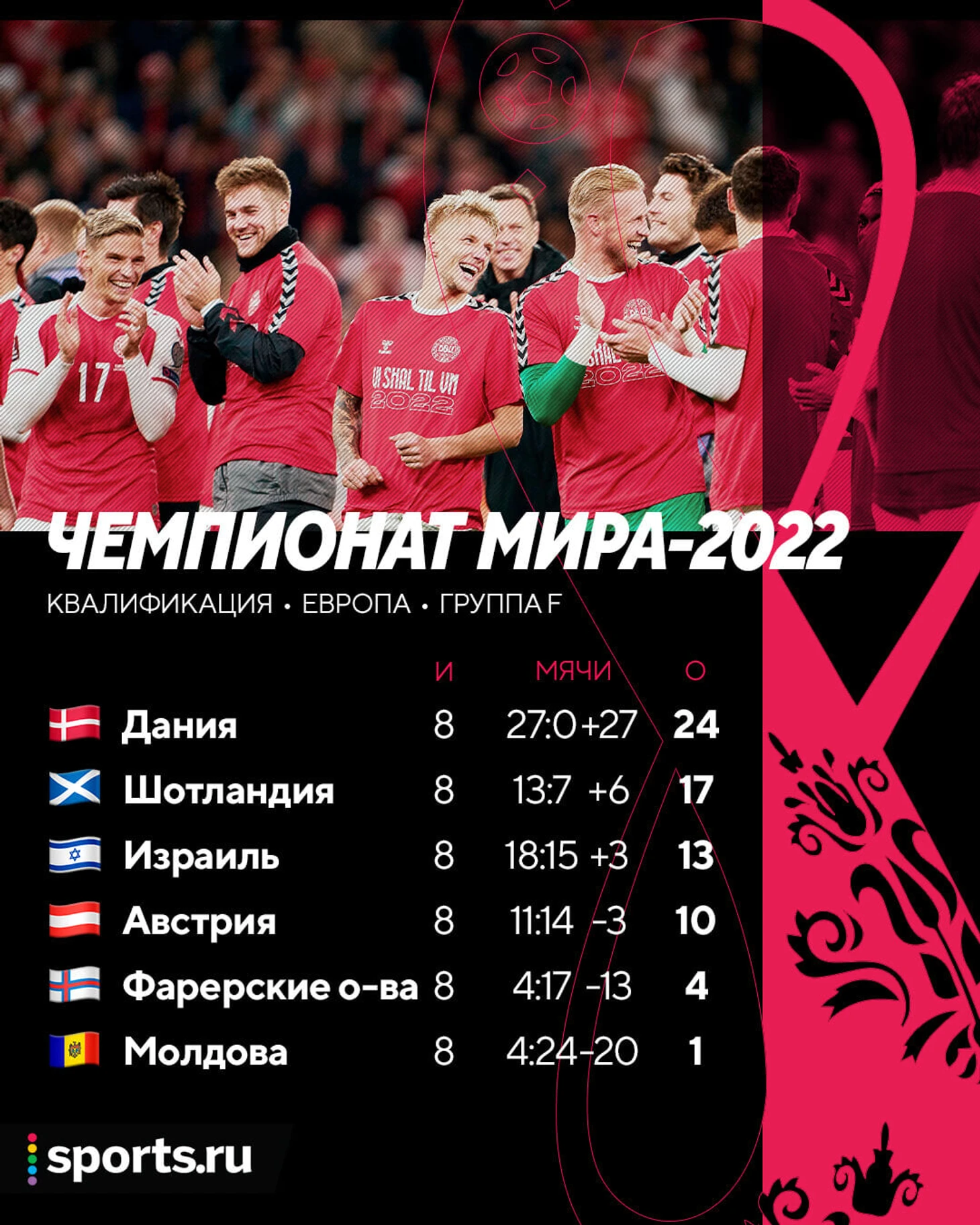 • Дания с голом Йоакима Мэле обыграла Австрию (1:0) и забронировала участие в ЧМ-2022. 8 матчей, 8 побед, разница мячей 27:0 – просто потрясающе.