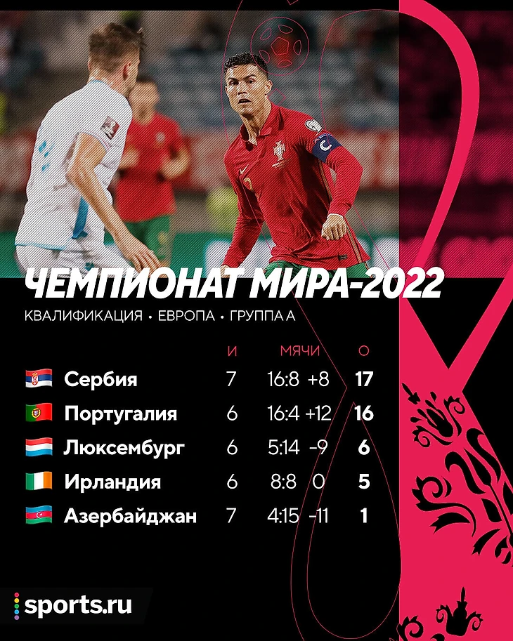 • Оба фаворита спокойно гарантировали себе финиш в топ-2: Сербия разобралась с Азербайджаном (3:1), а Португалия закинула Люксембургу 5 голов с хет-триком Криштиану Роналду (5:0).