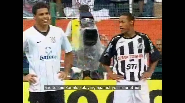 • Дальше Неймар вспоминает свой единственный матч против Роналдо. Суперзвезды пересеклись в 2009-м, в финале Лиги Паулиста: 17-летний Ней только-только начинал разрывать за «Сантос», а 32-летний Роналдо восстанавливался от травм в «Коринтиансе». DAZN показывает архивные кадры матча: Пеле напряженно всматривается из вип-ложи, когда суперзвезды сходятся на предматчевом рукопожатии, затем Неймар смеется, когда оказывается в штрафной рядом с Роналдо.