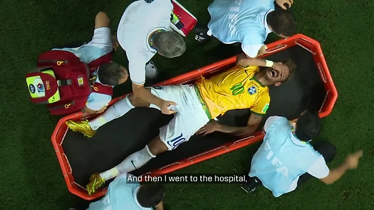 В блоке про ЧМ-2014 Неймар не меньше минуты говорит о детской мечте выиграть домашний ЧМ. Дальше нас перемещают к матчу 1/4 финала Колумбия – Бразилия и трагической травме Неймара, когда защитник Суньига въехал ему коленом в спину. На этот моменте Неймар оживляется и явно ощущает себя героем голливудского байопика: демонстративно играет на камеру, глаза увлажняются, а уже через пару минут начинает плакать.