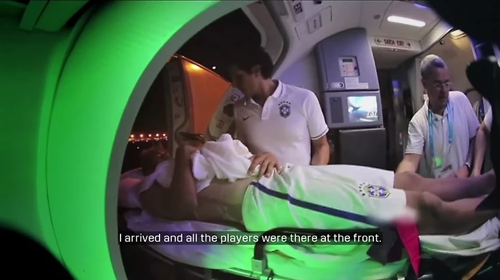 Дальше нам показывают видеохронику: как Неймара загружают в машину скорой помощи, на инвалидной коляске привозят в аэропорт, где сборная Бразилии (уже добившая Колумбию) садится в самолет. «У всех игроков были красные глаза, они плакали, – продолжает Неймар под эмоциональные кадры с объятиями. – Мой отец тоже там присутствовал, его посадили в самолет сборной. Я не мог сказать ни слова, просто плакал».