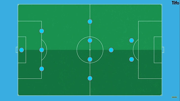 Эта система обеспечивает ширину игры, поддерживаемую фланговыми игроками, хотя иногда один центральный защитник также смещается в ширину, чтобы облегчить продвижение мяча из глубины поля. Центральные полузащитники меняют позиции, чередуясь впереди и позади линий прессинга соперников. Команда стремится создать ромбовидную форму, которая обеспечивает пространство и возможности для передач. Структура 3-4-1-2 затем преобразуются в 3-2-5 или даже 2-3-5 в атакующей стадии игры, с большим количеством изменений позиций игроками.
