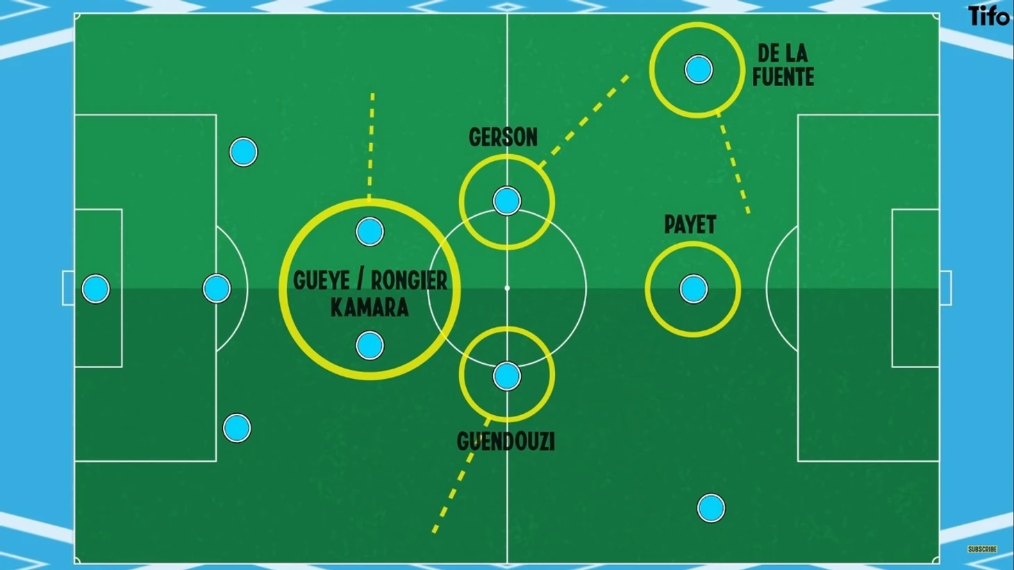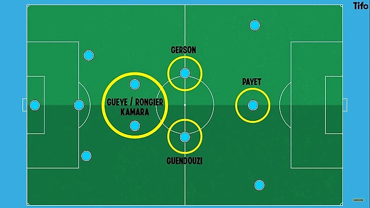 Построение команды с тремя защитниками изначально узкое: Жерсон Сантос и Гендузи выше Папы Гуйе, Валентин Ронгье, или Бубакар занимают позиции в центре поля. Ширину поля обеспечивают вингеры, в то время как Жерсон особенно много работает на бровке, в широкой позиции - слева.