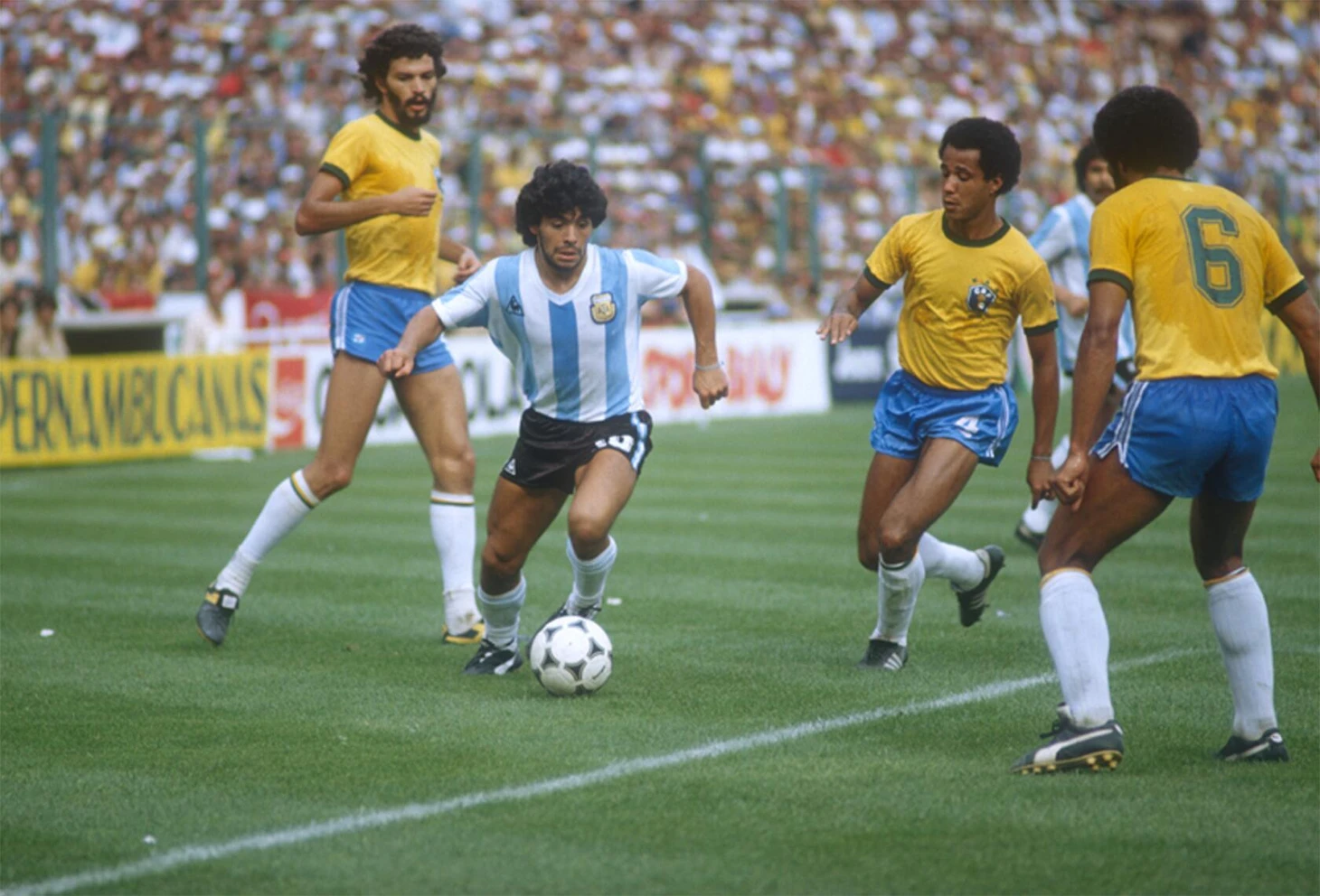 ЧМ-1982. Марадона...в очередном прорыве к воротам бразильцев (в окружении, слева-направо: Сократес- Луизиньо- Жуниор...)