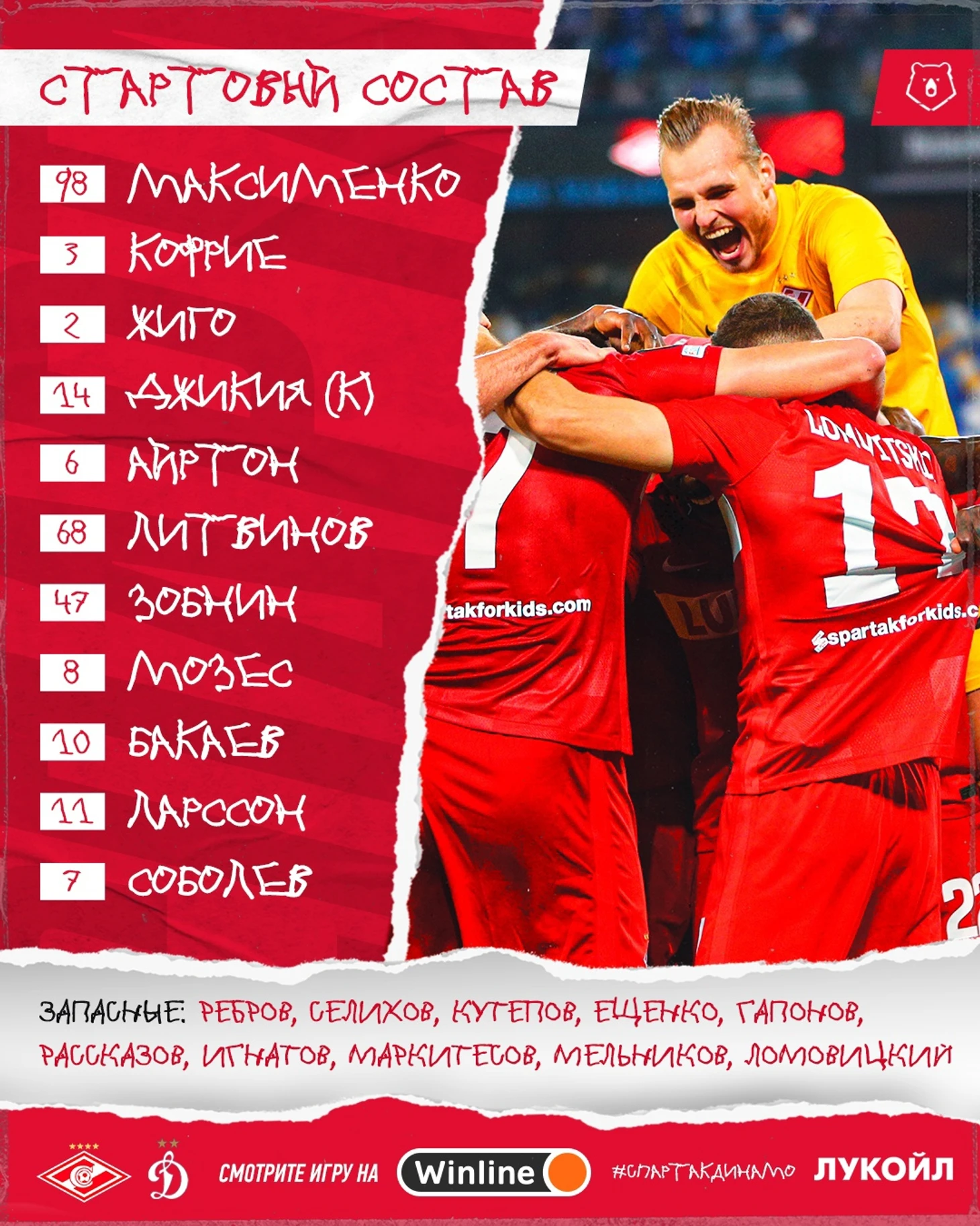 С первых минут сыграют: Максименко, Кофрие, Жиго, Джикия (к), Мозес, Зобнин, Литвинов, Айртон, Бакаев, Ларссон, Соболев.