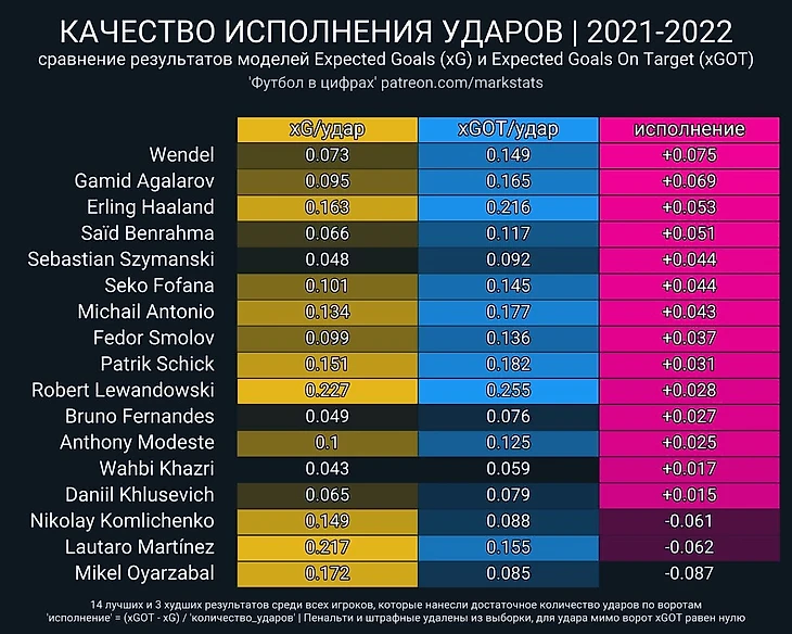 Лучшим по этому показателю в Европе на данный момент возможно неожиданно для вас, является полузащитник Зенита Маркус Вендел. У него разница между xGOT и xG в пересчете на один удар +0,075. Говоря простым языком, в среднем в его исполнении изначальная опасность удара возрастает на 7,5%. Но полагаю куда большей неожиданностью будет для вас то что на втором месте расположился Гамид Агаларов. У нападающего «Уфы» показатель исполнения исходя из расчета равен +0,069. В этом сезоне в чемпионате он сыграл 10 матчей и забил 8 голов, неплохой результат для его скромной цены на трансфермаркет в 1,2 миллиона «европейских рублей». Третьим в списке идет уже более звездный игрок Эрлинг Холанд с показателем +0,053. У него намного выше опасность ударов (xGOT) чем у оппонентов которые расположились выше списка, но изначальная позиция до удара (xG) у него также лучше, и поэтому разница чуть меньше чем у Агаларова и Вендела. Также в топ 14 попал Федор Смолов(+0,037).