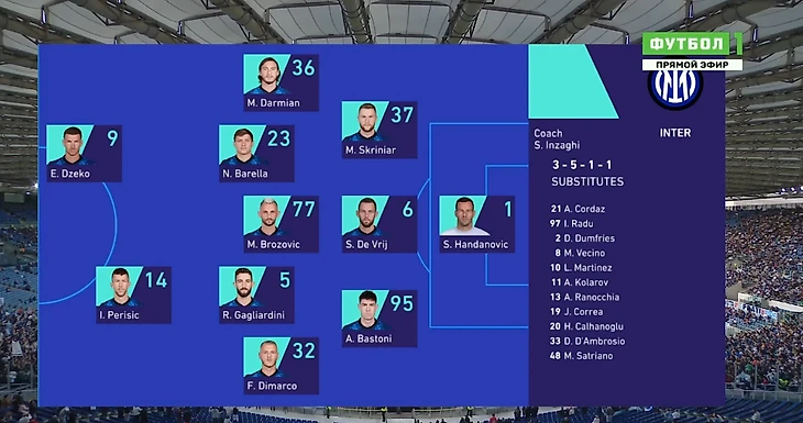 Индзаги немного видоизменил привычные 3—5—2 "Интера": Лаутаро Мартинес не попал в стартовый состав, его место в центре нападения занял Иван Перишич, за левый фланг полузащиты отвечал Федерико Димарко. Кроме того, место Хакана Чалханоглу занял Роберто Гальярдини. Получились 3—5—1—1