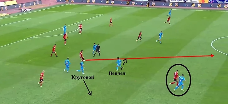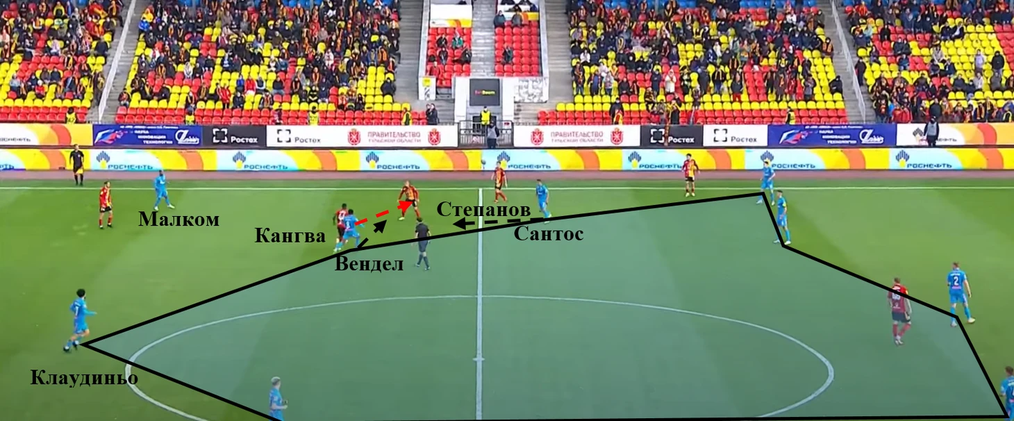 1. Переход на 4-4-2 в середине 2го тайма добавил Зениту мощи в атаке, но ухудшил оборону. Малком, прессингуя неопасного игрока Арсенала, потерял позицию в обороне. Его зону, куда прилетел мяч, закрывает ЦОП Сантос. Вендел остался в полупозиции, пытаясь взять весь центр на себя. Малком не спешит возвращаться в оборону.