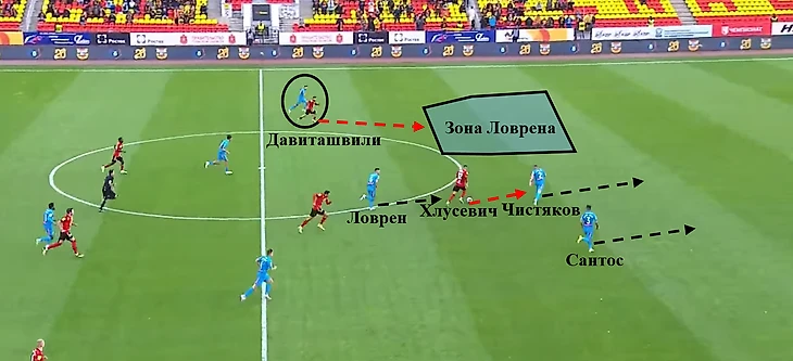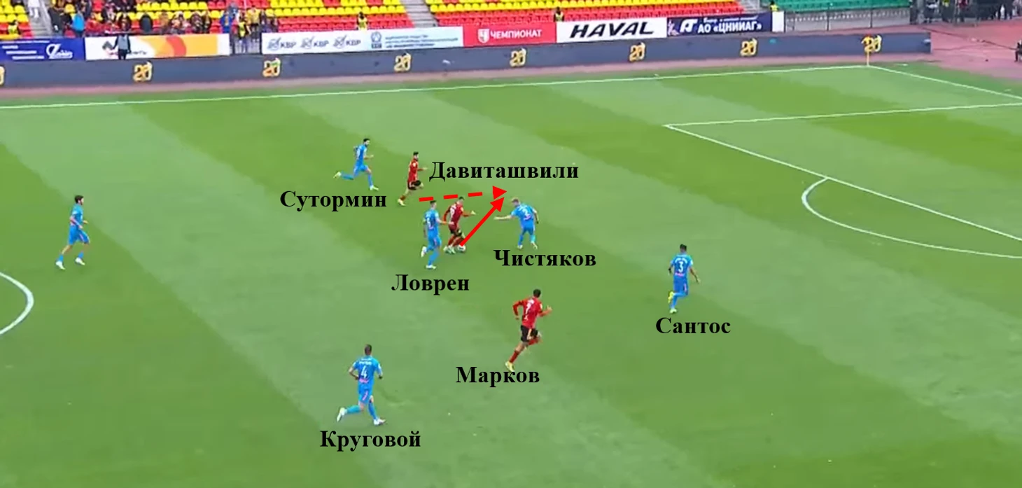 3.В итоге ЦЗ не встречают Маркова. Он отдаёт передачу на Хлусевича, с которым плотно играет Сантос. В зону Ловрена мчится Зурико, Сутормин пытается его догнать.