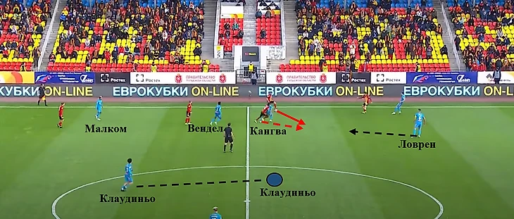 2. Мяч получает Кангва, к нему смещается Вендел, оставляя ВЕСЬ центр пустым. Малком все еще не спешит, а Клаудиньо не страхует Вендела. В центре поля огромная свободна зона.