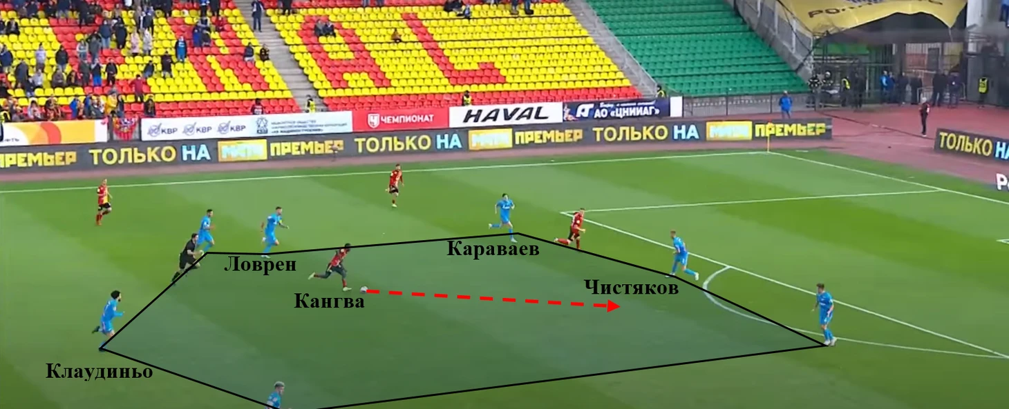 3. Сыграв в стенку со Степановым, Кангва отклеился от Сантоса и Вендела. Клаудиньо на помощь не спешит.
