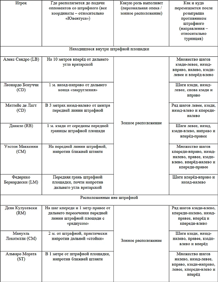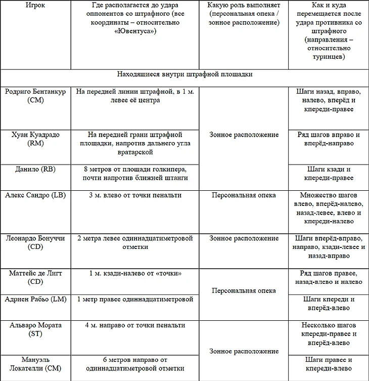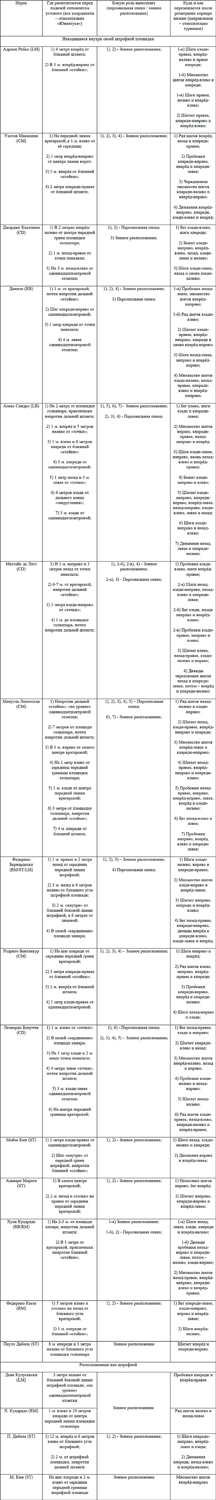 Абсолютно бесполезны в противостоянии с «бьянконери» различного вида штрафные. Оборонцы «Ювентуса» грамотно фолят, делают это довольно редко и достаточно далеко от своих владений. Так, чтобы противник мог только разыграть сей «стандарт», а не бить с него напрямую. Но и здесь статистика удручает. В среднем до удара по «рамке» туринцев получается довести примерно лишь один подаваемый штрафной из семнадцати! Для этого желательно навешивать к дальней штанге. Конкретнее: в точку на 1 метр левее (относительно «Старой синьоры») и 9 м. вперёд от соответствующего угла вратарской. Там находящемуся под присмотром Кулусевски необходимо бить в левую от Войчеха Шченсны «шестёрку». На самом деле произвести подобную подачу не так-то сложно, учитывая, что зачастую при изучаемом стандартном положении в «стенку» среди подопечных Аллегри отряжается только один Пауло Дибала. Он при навесе соперника «с места» прыгает с разворотом через правое плечо на 2400 и несколько раз шагает кзади-налево. Прочие товарищи аргентинца по команде тем временем вшестером выстраиваются внутри собственной штрафной, а ещё три представителя «Старой синьоры» остаются за пределами названной площадки. Подробности данных локализаций с их дальнейшими сменами описываются в такой таблице: