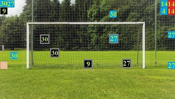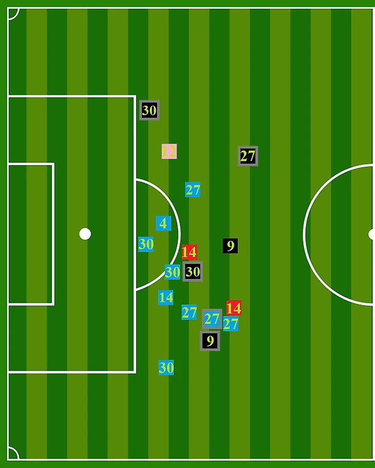 Расшифровка условных обозначений: 1) квадраты указывают на конкретные участки газона, с коих производили удары из-за штрафной площадки оппоненты «Старой синьоры» (первая схема), и отношение данных «выстрелов» к створу ворот коллектива Массимилиано Аллегри или областям возле «рамки» (второй рисунок); 2) цвет фигур свидетельствует о видах эпизодов, при которых были нанесены эти удары: голубой – при затяжных наступлениях, красный – в процессе встречных и быстрых атак, розовый – после случайных отскоков игрового снаряда от итальянцев; 3) числа внутри четырёхугольников соответствуют номерам футболистов чёрно-белых, разрешивших пробить по их воротам издали: 4 – де Лигт, 9 – Мората, 12 – А. Сандро, 14 – Маккенни, 27 – Локателли, 30 – Бентанкур; 4) серая окантовка квадратов означает попадание в створ.